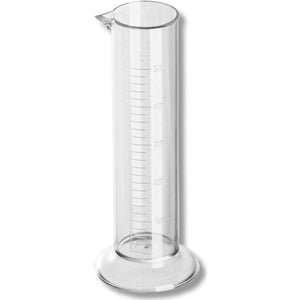 Ideal for accurately measuring chemistry, this 2 oz / 50mL Graduated Cylinder from Samigon is constructed from impact-resistant clear plastic, can withstand temperatures up to 212°F, and features a convenient pouring lip as well as an oversized base for stability. This graduate offers measurements in both ounces and cubic centimeters (mL) with markings up to 2 oz and 50mL, respectively.