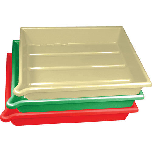 This set of three trays includes one tan tray, one red tray, and one green tray for easy identification of various chemistry solutions.
