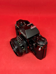 The Canon A-1 is a manual focus 35mm film SLR camera. Introduced in 1978 the A-1 followed the successful AE-1 as a higher end premium option that notably features Aperture Priority AE (AutoExposure) and Program AE exposure modes. Though not as ruggedized as Canon's considerably more expensive F-1 workhorse, the A-1 was for a number of years Canon's most technologically advanced SLR becoming a mainstay for many pros who also appreciated it's reasonable weight and compact companion, the 5fps Motor Drive MA.
